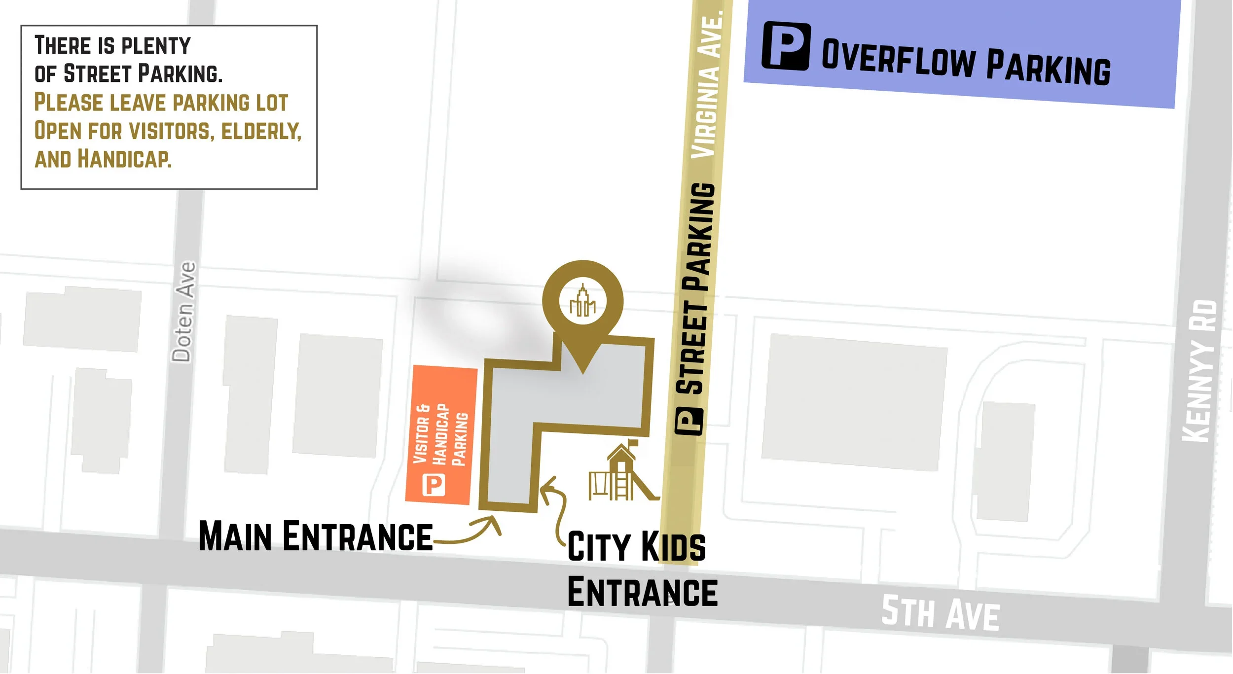 The church has limited parking, so please park on Virginia Ave. or in overflow parking off Virginia Ave. Please reserve the church parking for the elderly and those with disabilities and enter the church through the Main Entrance or City Kids Entrance.